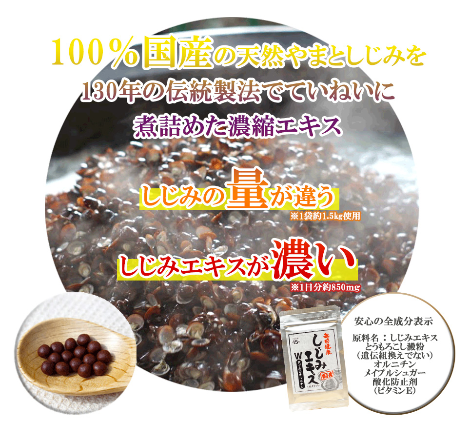 しじみ由来のオルニチンではなく、本物の国産やまとしじみを煮込んでギュッと閉じ込めました。
